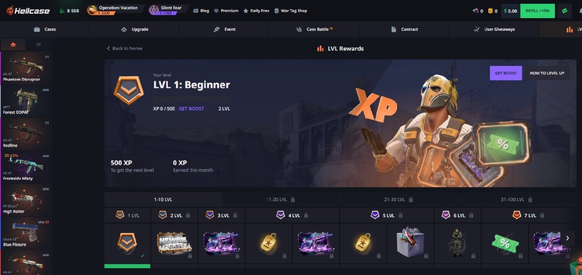 Kaikki toiminta Hellcasessa kerryttää edistymistä. Tason noustessa avautuu uusia etuja, kuten lisäpalkintoja, parempia bonuksia tai erikoiscaseja. Järjestelmä on rakennettu niin, että eteneminen tuntuu luonnolliselta eikä vaadi aggressiivista pelaamista.